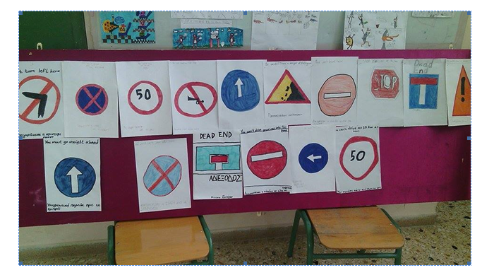 Οι μαθητές της Δ τάξης είχαν κατασκευάσει σήματα οδικής κυκλοφορίας με οδηγίες στα ελληνικά και αγγλικά τα οποία εξέθεσαν για να ενημερωθούν και οι υπόλοιποι.