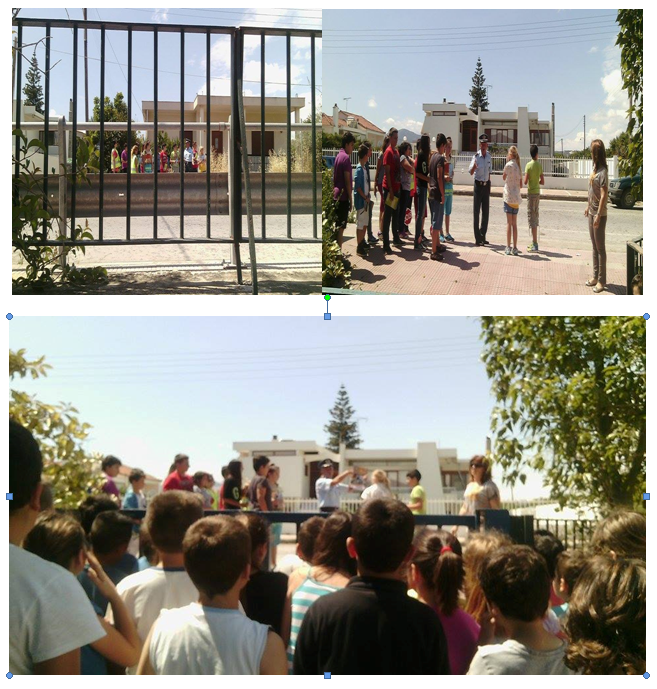 Στη συνέχεια ο τροχονόμος έβγαλε τους μαθητές στο προαύλιο και με τη βοήθεια των μεγαλύτερων μαθητών της ΣΤ τάξης έδειξε στα παιδιά τι να προσέχουν και πώς να κυκλοφορούν με ασφάλεια σε πραγματικές συνθήκες.